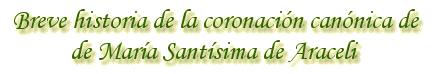 Las circunstancias políticas de la época republicana, la Guerra Civil y sus consecuencias socioeconómicas impidieron el progreso hacia su logro de la idea de la Coronación Canónica de María Santísima de Araceli. Fue necesario esperar hasta el 23 de marzo de 1943 para que el entonces alcalde don Francisco Moreno Güez, retomando oficialmente el proyecto de la coronación canónica de la Patrona, presentó una moción al Ayuntamiento en este sentido, que la Corporación aprobó de manera unánime. |